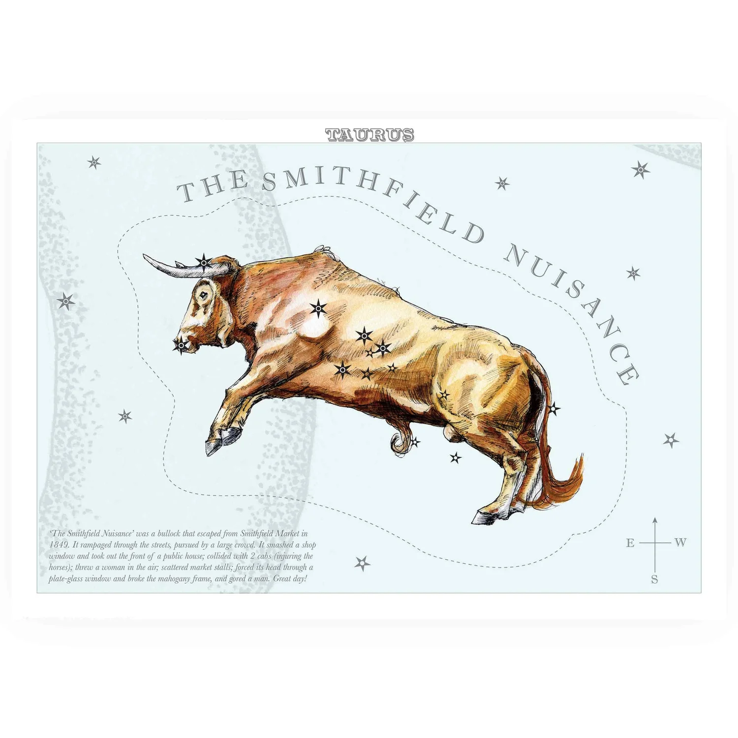 12) Taurus (Bull), featuring the Smithfield Nuisance, a bull who escaped and caused havoc in Smithfield Market in 1849.