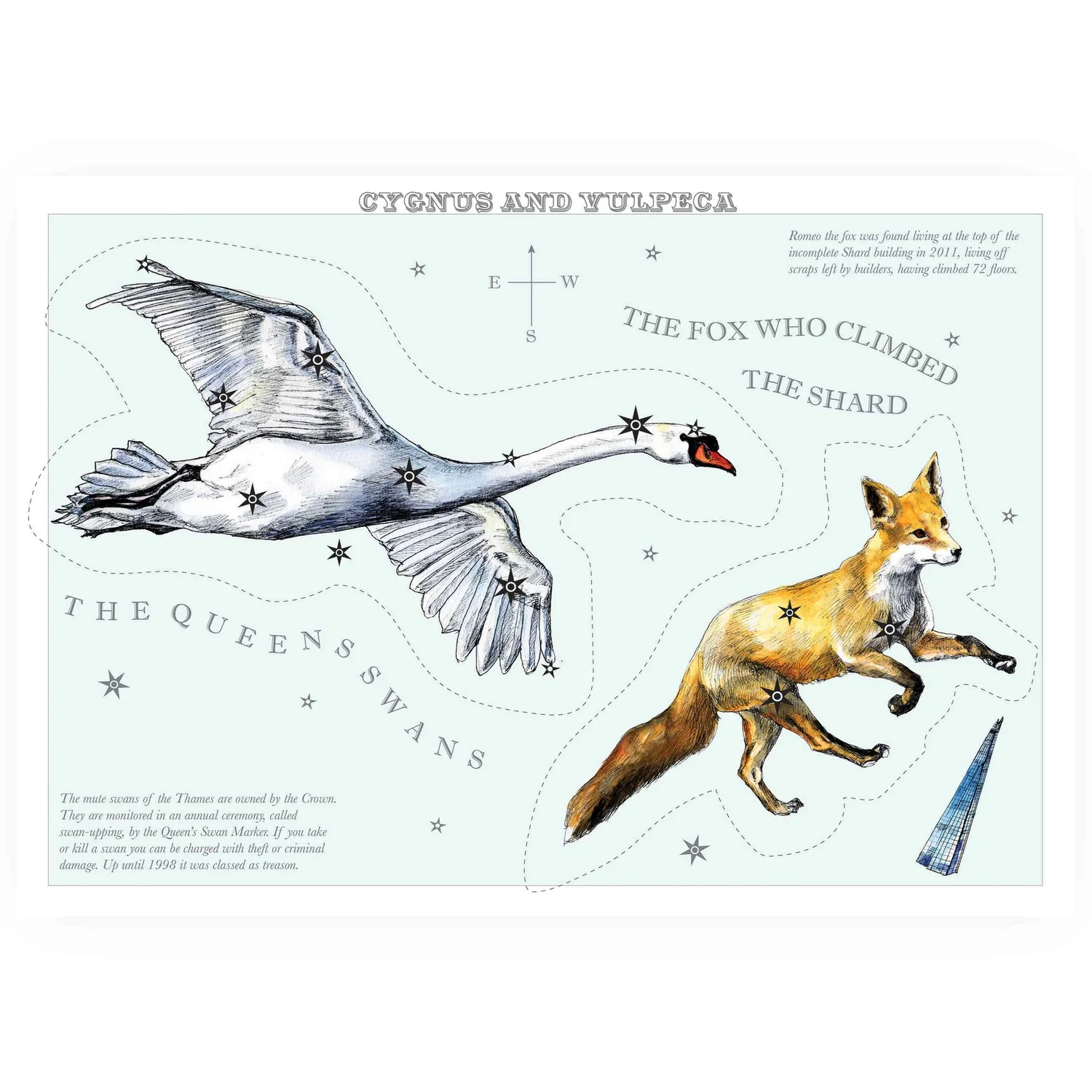 1) Cygnus and Vulpecula (Swan and Fox), featuring the queens swans and the fox who climbed the shard.