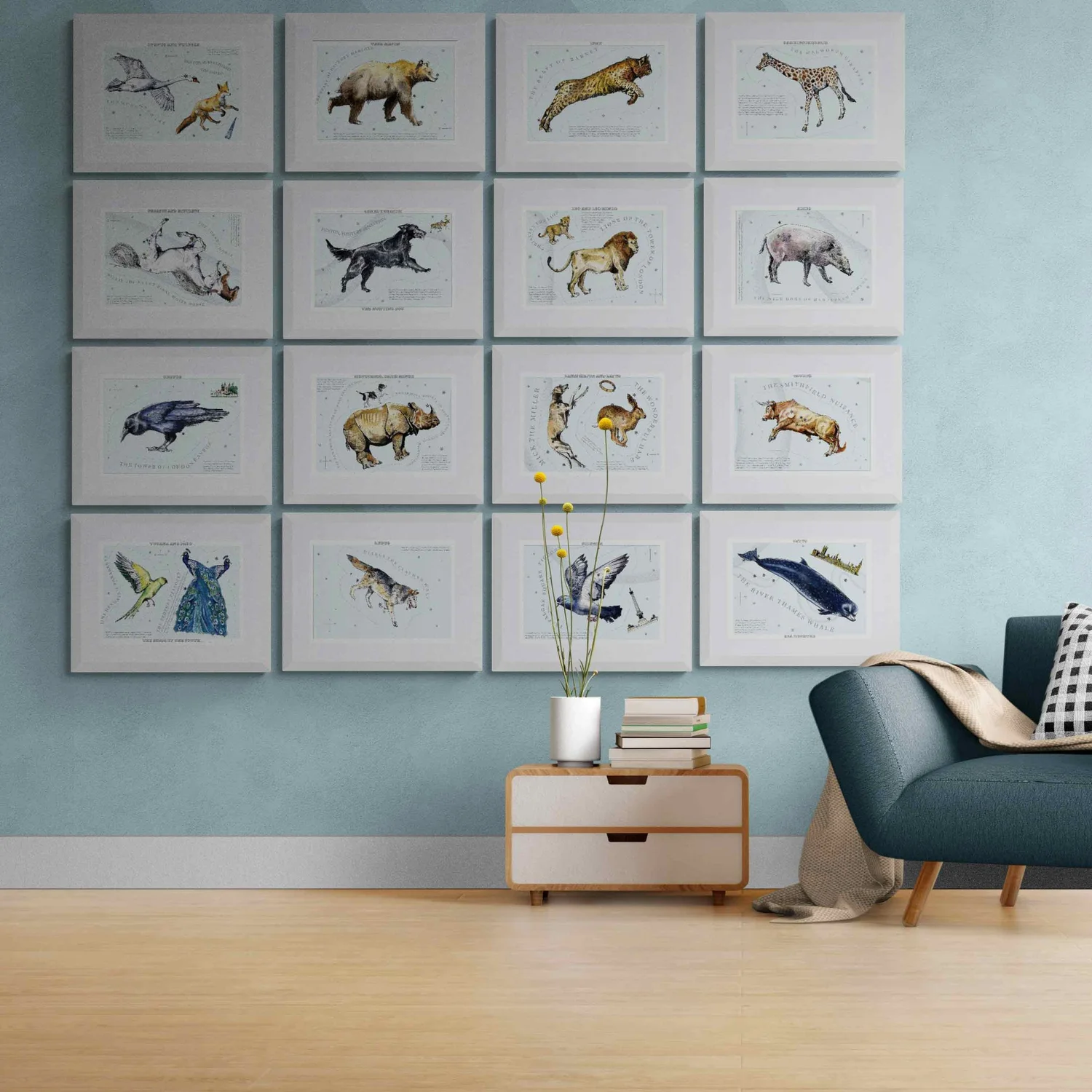 Featured animals and their corresponding star constellations (numbered from top left) are: