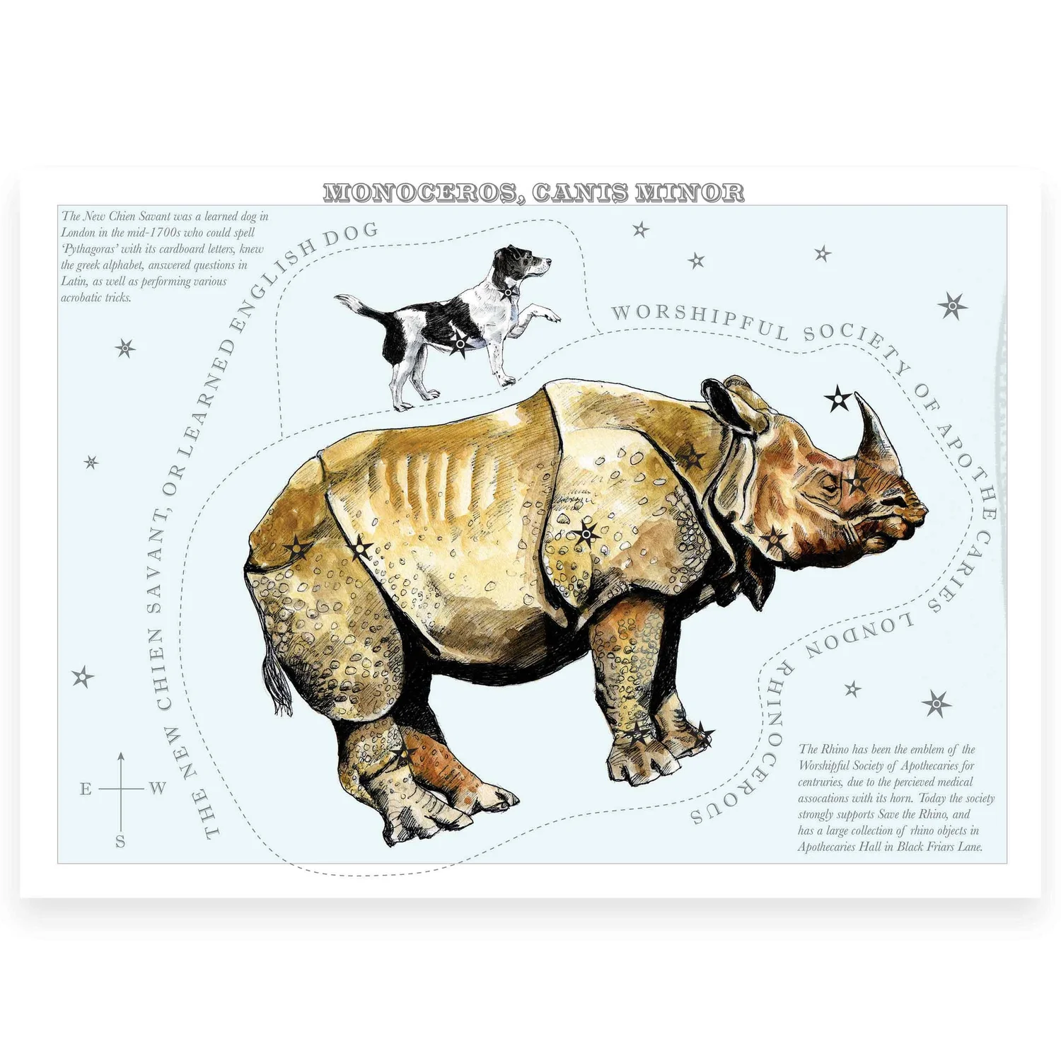 10) Monocerous and Canis minor (Unicorn and small dog), featuring the rhinos of the Worshipful Society of Apothecaries London and The New Chien Savant, a learned dog who knew Latin and Greek.